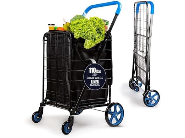 SereneLife Large Folding Utility Shopping Cart with Removable Liner – Heavy Duty, 360° Swivel Wheels, 110 lb Capacity, Portable for Groceries, Laundry, Luggage, and More (Blue)